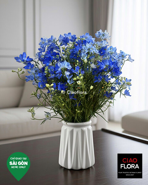 How do you send a moment of tranquility across the globe? This is 'Blue Delphinium'. It is not just a vase of flowers; it is a quiet breath, a piece of the sky delivered.